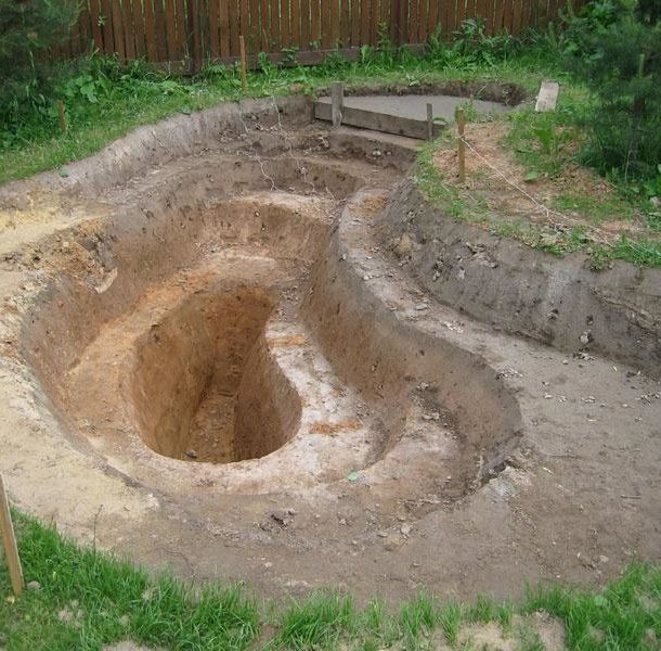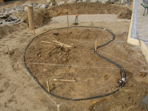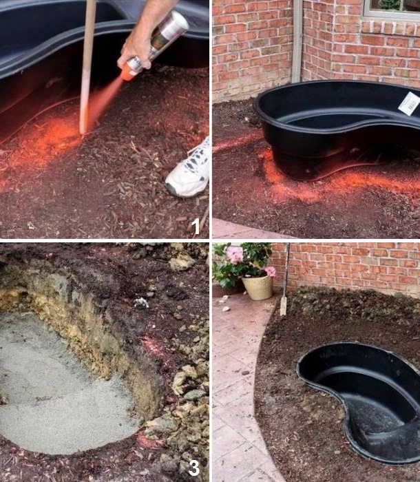 S'il est plus pratique pour vous de travailler avec le formulaire fini, le plus difficile sera de creuser une fosse en dessous. Après tout, il doit clairement répéter tous ses virages et différences de profondeur, mais en même temps être 10 à 15 cm plus grand le long du contour.
