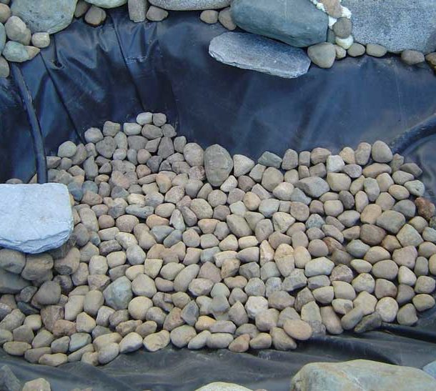 - Lors de l'étalement du film, assurez-vous de le poser à l'état libre et, à l'aide de pierres de taille moyenne, fixez-le sur les terrasses afin que le film suive bien les contours du fond;