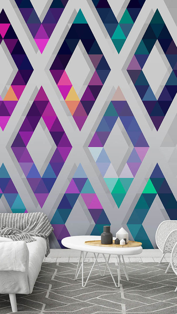 - Losanges ou triangles capable de donner de la légèreté et de l'énergie à l'intérieur. Ce modèle, en fonction de la manière de son exécution et de la palette de couleurs, est également très activement utilisé pour différentes pièces et différents styles d'intérieur. Si le contour rhombique est formé par de fines lignes claires sur un fond en sourdine, ces papiers peints peuvent être utilisés pour coller tous les murs. Si les losanges ont des couleurs contrastées, ils sont mieux utilisés comme insert décoratif. Les diamants de différentes nuances de la même couleur, fabriqués dans des couleurs pastel atténuées, conviennent à intérieurs classiques. Diamants de différentes tailles et de différentes couleurs - l'option la plus dynamique, qui est également préférable d'utiliser pour la décoration mur d'accent;
