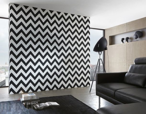 - Chevron - zigzag ou chevrons. C'est cet ornement qui est préféré lors de la création d'intérieurs audacieux et modernes. Zigzag est une impression appropriée pour n'importe quelle pièce.En soi, ce modèle est très dynamique et dynamique, alors n'en abusez pas. Le chevron peut être à la fois prononcé lorsque la couleur du motif contraste avec la couleur de la base, et plus calme. Le papier peint du premier type est mieux utilisé pour finir un mur ou une partie de celui-ci. Si le motif a des pics bas et une teinte pastel, ils peuvent complètement coller sur tous les murs. En même temps, le zigzag a une propriété intéressante - il brouille parfaitement les frontières et lisse tout bosses ou des saillies. Par exemple, si les murs sont décoratifs niches, ayant collé leurs surfaces intérieures avec un tel papier peint, il sera difficile à première vue de les distinguer sur le plan du mur;