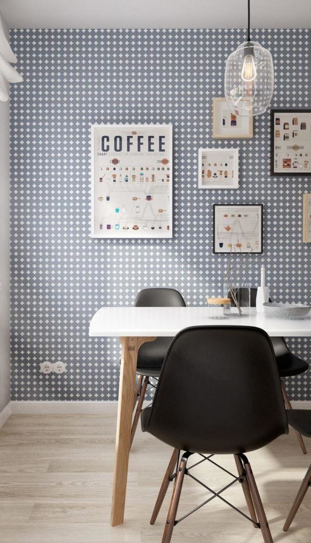 Lors de l'application de papier peint à imprimé géométrique, il est très important de maintenir le bon équilibre et de ne pas surcharger l'intérieur à la fois en couleur et en termes décoratifs.