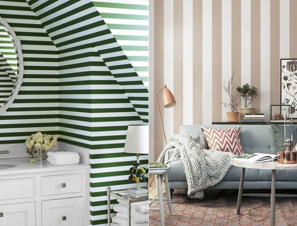 - Motif classique - rayures. Il est très populaire et complète parfaitement les intérieurs dans des styles classiques. Les rayures peuvent avoir une direction verticale ou horizontale. Très rarement - en diagonale. Les bandes doivent être choisies lorsqu'il est nécessaire de changer la géométrie de la pièce. Le modèle dirigé verticalement est capable de rendre le plafond plus haut. Une bande horizontale prolonge la surface sur laquelle elle est collée. La direction diagonale est la plus intéressante - elle est capable de flou des frontières et les angles font pièces longues et allongées plus carré. Soyez prudent lorsque vous choisissez la largeur et la couleur des rayures. Plus leur ton est fin et contrasté, plus ils occuperont d'espace. De plus, une telle décoration dominera l'intérieur. Des bandes de nuances plus larges proches les unes des autres ne réduiront pas la pièce;