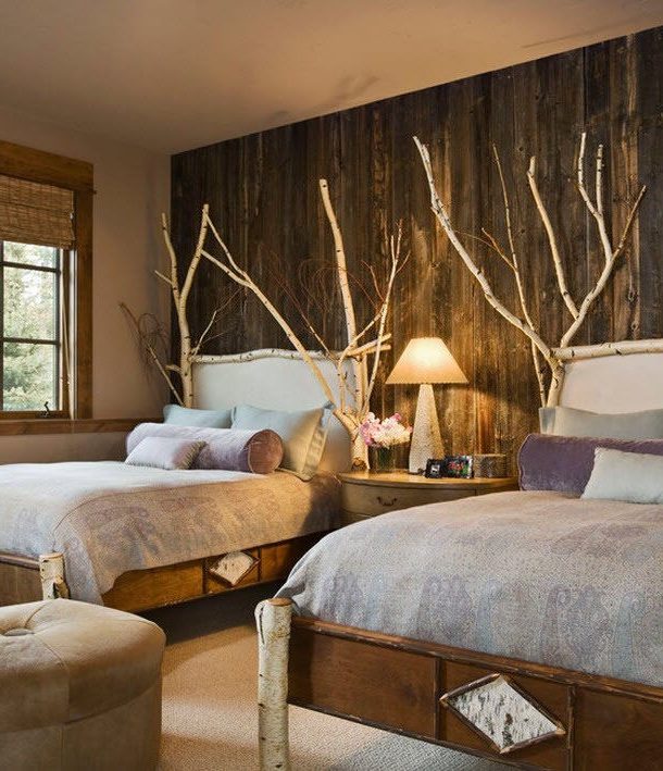 - Dans chambres à coucher les finitions en bois sont le plus souvent utilisées pour mettre en évidence tête de lit. Cette décoration semble expressive et ajoute à la pièce une sensation de chaleur et de confort. Les toiles de teintes naturelles de bois clair ou de teintes blanches sont préférées. Dans le contexte d'un insert en bois, les meubles en bois naturel ont fière allure. Si le papier peint est sélectionné en blanc, le meuble peut avoir une teinte contrastée;
