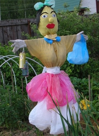 Un autre gardien «parlant» peut être un épouvantail de sacs en plastique.Seulement ordinaire mince Les t-shirts ne fonctionneront pas - ils se déchireront très rapidement sous l'influence de fortes rafales de vent et voleront dans tout le quartier. Nous utiliserons de gros sacs denses des supermarchés ou des sacs à ordures denses.