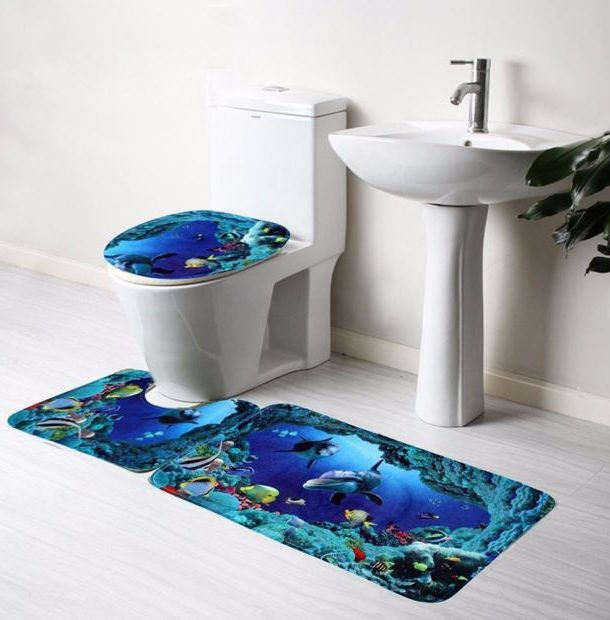 - Tapis sur le couvercle des toilettes. Cet élément est plus décoratif que pratique, mais est souvent inclus dans le jeu de tapis de sol. Il est conçu pour créer une composition unique. Une telle chose sera vraiment utile s'il y a des petits enfants dans la famille qui aiment être près de vous, lorsque, par exemple, vous nettoyez la salle de bain ou faites la lessive. Ensuite, il sera pratique pour eux de s'asseoir sur un tapis doux fixé au couvercle;