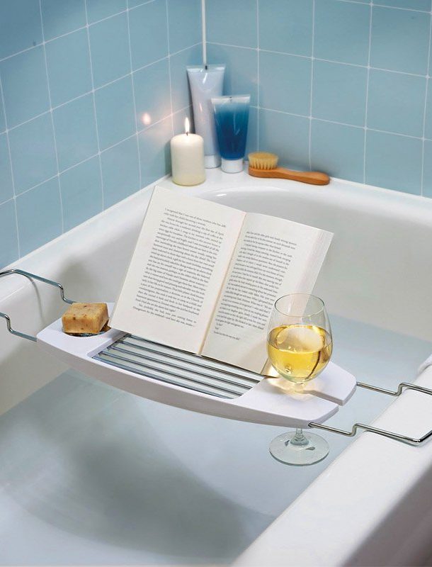 - Étagères amovibles. Il ne s'agit pas d'étagères pour ranger les accessoires de bain, mais d'une étagère qui, si nécessaire, peut reposer sur les côtés de la baignoire et tout aussi facile à nettoyer. Il est pratique de mettre un livre dessus, de mettre un miroir et, assis dans le bain, d'effectuer des procédures cosmétiques, de boire du thé, etc. Si vous avez des enfants, ils peuvent ranger leurs jouets sur une étagère. Dans ce cas, il vaut mieux préférer les modèles en plastique ou en bois, plutôt qu'en verre;