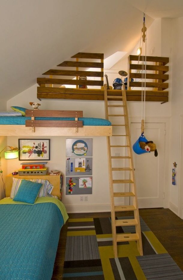 - La troisième est la meilleure option, s'il faut aménager la chambre d'un adulte et d'un enfant dans une petite pièce. Le lit parent est situé au niveau de la mezzanine, et en dessous se trouve un espace pour les enfants.;