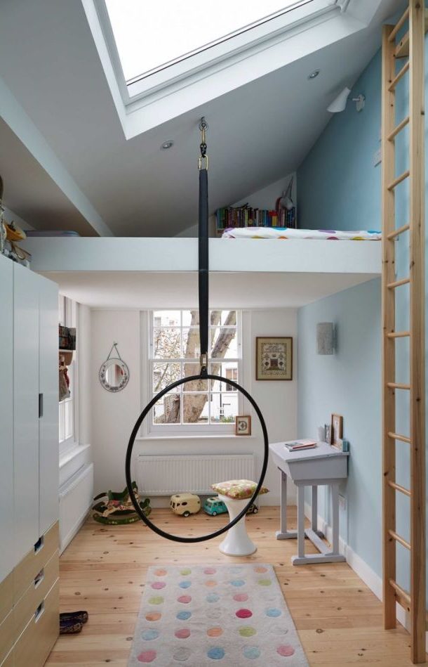 - Si l'enfant est déjà assez âgé et va à l'école, vous devrez peut-être séparer l'aire de jeux de la chambre et du travail. Vous pouvez soulever une couchette sur la mezzanine, et sous elle mettre un bureau et des étagères. Libérez ensuite une partie de la pièce où l'enfant peut passer du temps avec des amis. Ou donnez la mezzanine à la salle de jeux et laissez le lit et la table au rez-de-chaussée. Une telle idée ravira les enfants, car souvent la mezzanine est associée à la ressemblance d'une cabane dans les arbres - son espace personnel;