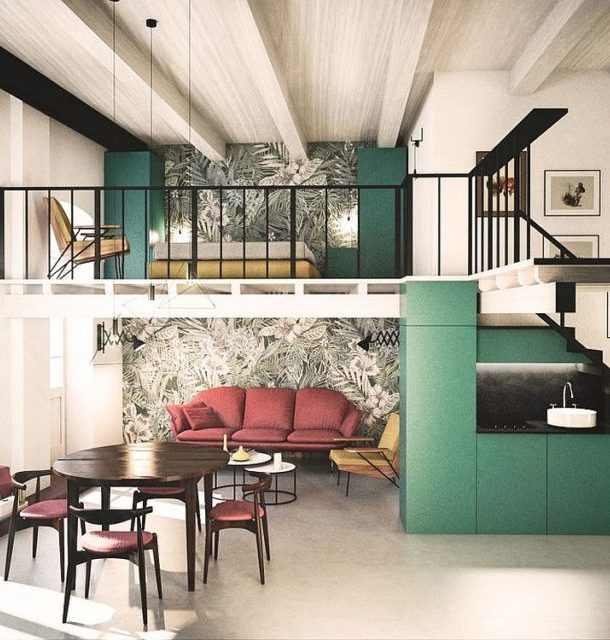 Si la mezzanine est située au-dessus du coin cuisine ou au-dessus du coin salon du salon, vous pouvez l'utiliser comme petite bibliothèque à domicile ou bureau personnel.