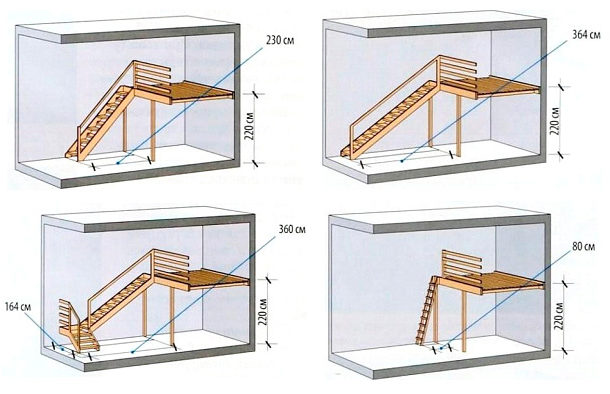 - Type d'escalier. Escalier, en particulier dans les petits appartements ou les studios, peuvent être un vrai problème. En effet, afin de le rendre pratique, la distance entre ses marches ne doit pas dépasser 25 cm et leur profondeur d'au moins 30 cm Pour les familles avec enfants, les plus commodes sont la volée d'escalier. De plus, la travée doit avoir des mains courantes. L'option la plus pratique pour leur placement est près d'un des murs.Cela permettra d'utiliser la place sous la travée. L'avantage des escaliers en colimaçon est qu'ils peuvent être situés n'importe où sur la mezzanine, selon les besoins. Cependant, il peut être difficile pour les personnes âgées de grimper, elles doivent s'adapter au mouvement en cercle et il peut être difficile d'amener des objets dimensionnels sur la mezzanine. Afin de gagner de l'espace, beaucoup préfèrent utiliser des échelles. Mais ils peuvent être dangereux pour les enfants et les adultes. En utilisant de tels escaliers, il est nécessaire d'assurer une fixation fiable de ses extrémités, à la fois dans le plan du sol et dans la mezzanine. Les options possibles pour l'installation des escaliers sont illustrées dans la figure;