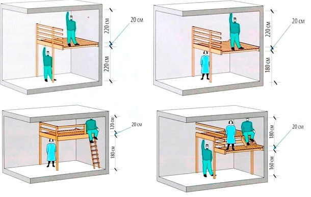 - La hauteur mezzanines. Après la construction de la superstructure, les deux étages ne se sont avérés complets que dans les appartements où la hauteur du plafond est de 5 m. Considérant que les appartements de cette échelle n'existent pas ou existent en petites quantités, beaucoup de gens pensent à construire une mezzanine avec des hauteurs de plafond de 3 Dans ce cas, il n'y a que suffisamment d'espace pour placer une personne en position assise et couchée. Calculer la hauteur les mezzanines peuvent selon la formule. Vous devez ajouter 20 cm à la croissance de la personne la plus grande de votre famille à trois reprises (la distance du haut de la tête au plafond de la mezzanine, l'épaisseur moyenne des dalles utilisées pour se chevaucher, la distance du haut du plafond). Par exemple, 175 + 20 + 20 + 20 = 235 cm Cette valeur doit être soustraite de la hauteur du plafond de votre maison. Si nous parlons d'un plafond de 3 m de haut, alors après la construction de la mezzanine, la distance entre son sol et le plafond ne sera que de 65 cm, ce qui ne permettra pas à un adulte de s'asseoir sur le lit et de s'aligner. Hauteur minimale recommandée la mezzanine est de 120 cm. Ensuite, la hauteur du premier étage, compte tenu de l'épaisseur du sol, sera de 180 cm, ce qui nous donne une hauteur totale de plafond de 320 cm. Les options pour placer la superstructure avec différentes hauteurs de plafond sont illustrées sur la figure;