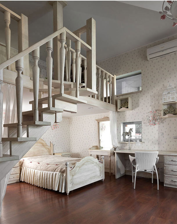 - La troisième est la meilleure option, s'il faut aménager la chambre d'un adulte et d'un enfant dans une petite pièce. Le lit parent est situé au niveau de la mezzanine, et en dessous se trouve un espace pour les enfants.;
