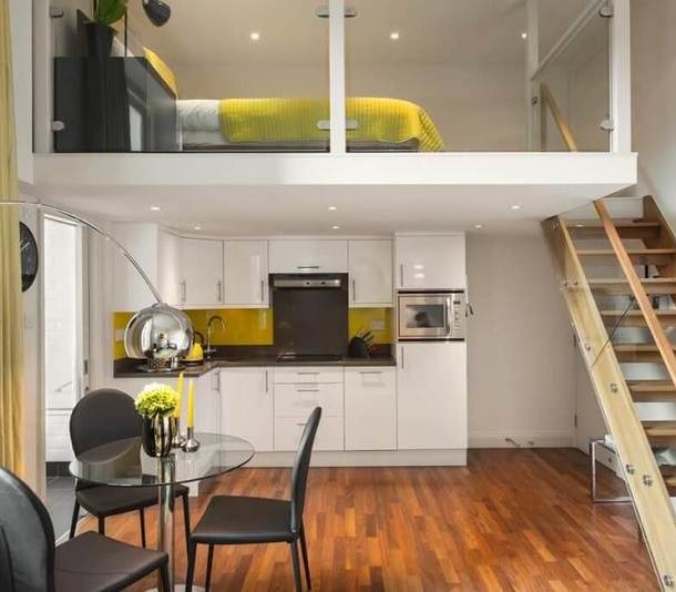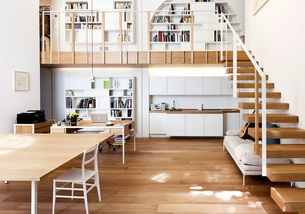 Si la mezzanine est située au-dessus du coin cuisine ou au-dessus du coin salon du salon, vous pouvez l'utiliser comme petite bibliothèque à domicile ou bureau personnel.