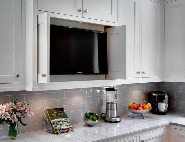 - Masquer tout technique et pas seulement la télévision, c'est possible dans les armoires de cuisine. Bien sûr, dans les petites cuisines c'est par rapport au téléviseur que cette option n'est pas très appropriée, car il y a déjà un manque constant d'espace. Surtout pour de tels cas, des téléviseurs sont disponibles qui sont attachés à une surface horizontale et, si nécessaire, sont pliés. Fixer un tel téléviseur, par exemple, en bas ensemble de cuisine, vous le rendrez presque invisible.