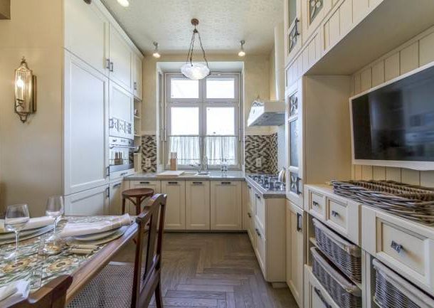 - La hauteur idéale pour le téléviseur est au niveau des yeux. Lors du choix, évaluez votre comportement dans la cuisine - êtes-vous plus susceptible de vous asseoir ou de vous tenir debout? En fonction de cela, choisissez une hauteur;
