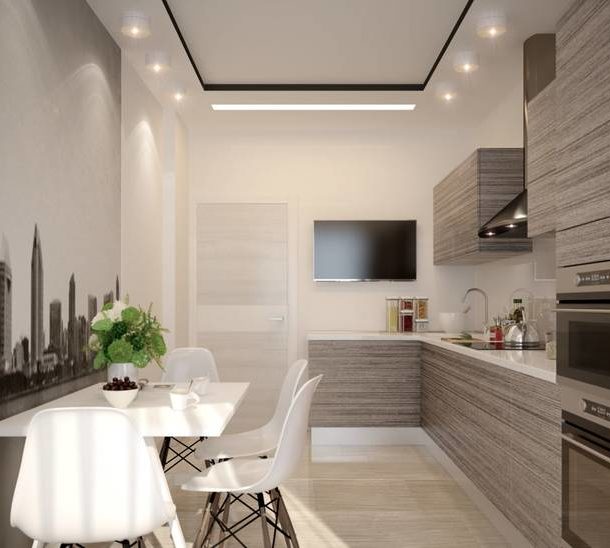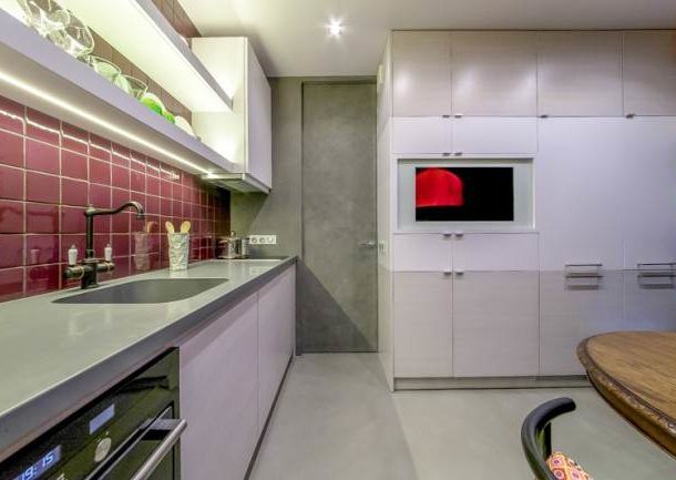 - Si la cuisine encadré dans un style moderne, mais l'intérieur est strict et sobre, il suffit juste de rendre le mur avec le téléviseur soigné.Cela signifie que tous les fils doivent être cachés.