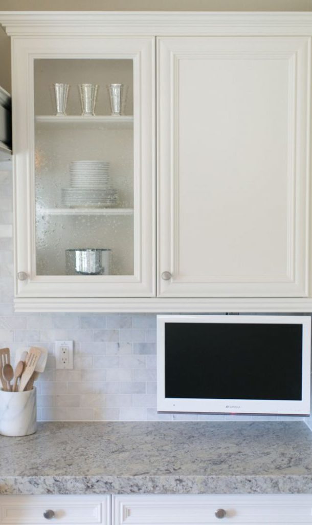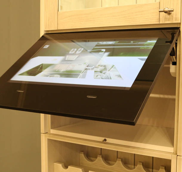 - Certains concepteurs ont trouvé une solution extraordinaire - le placement d'un téléviseur à écran plat pour ouvrier verrier un tablier. Bien sûr, cette méthode résout instantanément de nombreux problèmes, par exemple, protège l'équipement de l'humidité, des éclaboussures de graisse, de la poussière. Mais il est peu probable que le verre protège le moniteur de la chaleur s'il est placé immédiatement devant la table de cuisson. Et si le téléviseur tombe en panne? Est-ce facile à démonter?