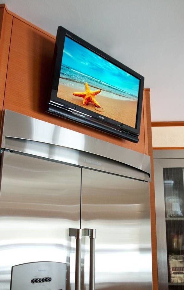 - Si la cuisine a un élément tel que comptoir de bar avec une visière, vous pouvez fixer le téléviseur dans les limbes sur son plan. Que cela prenne forme ou non dépend de vous;