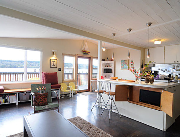 - Dans spacieux cuisines de salon très souvent présent îlot de cuisine. Et ils le placent souvent à la frontière de deux zones fonctionnelles, divisant l'espace. Si vous utilisez le téléviseur dans la cuisine uniquement comme arrière-plan et que vous ne regardez pas du tout l'écran, vous pouvez le monter dans le mur de l'îlot de cuisine depuis le salon, similaire à celui intégré cheminées électriques. Ainsi, le reste des membres de la famille, assis sur le canapé ou sur la chaise, il sera très pratique de regarder vos programmes préférés. Et les enfants peuvent regarder des dessins animés assis directement sur le tapis;