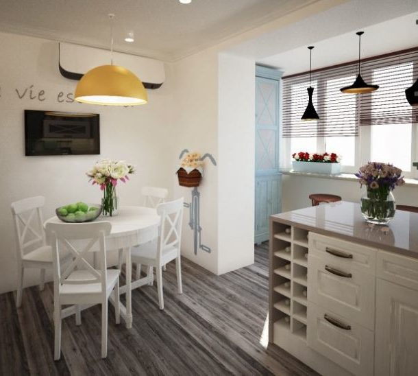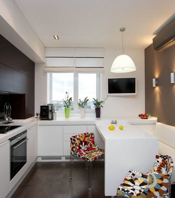- Par exemple, si la cuisine combiné avec balcon ou loggiamais en même temps, le rebord de la fenêtre n'a pas été démonté et agit comme une petite île de travail, la télévision peut être mise à sa surface;