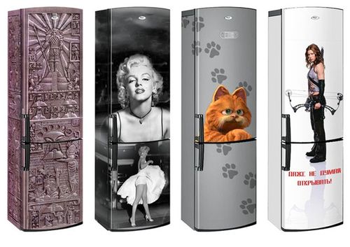 - Si vous hésitez à acheter une unité de couleur, mais ne souhaitez pas recourir à la version blanche classique, pensez aux réfrigérateurs avec une image ou des autocollants spéciaux en vinyle. Cela vous permettra de diversifier l'intérieur et d'y apporter des couleurs vives sans changements radicaux;