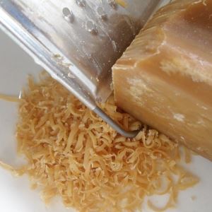 - Savon à lessive - aidera à faire face au jaunissement, si la cause de sa formation était une plaque grasse. La moitié de la barre doit être râpée sur une râpe grossière. Versez les copeaux de savon avec de l'eau tiède et laissez-les se dissoudre complètement en remuant de temps en temps. Cela devrait se révéler être une bouillie assez épaisse. Il doit être appliqué sur l'éponge et frotter soigneusement les zones jaunies. Pour obtenir un meilleur effet, la suspension restante est répartie uniformément sur les zones à problèmes et laissée agir pendant 30 minutes. Après cela, la surface est à nouveau essuyée avec une éponge, lavée avec de l'eau propre et essuyée;