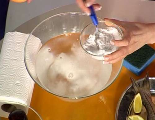- Solution de soude. Pour sa préparation, il est nécessaire de dissoudre 1 à 2 cuillères à soupe dans de l'eau tiède. bicarbonate de soude et mélanger jusqu'à ce que les particules se dissolvent.