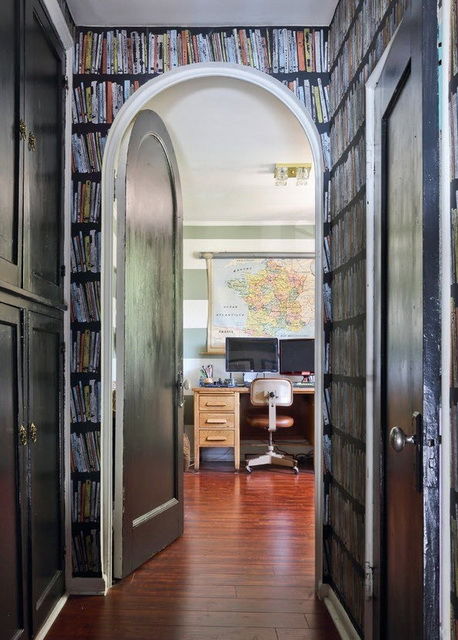 - Si la transition entre le couloir et la pièce adjacente se fait sous la forme ouverture cintrée, vous pouvez placer un fond d'écran autour de l'arc. Dans ce cas, vous devez choisir une image avec un petit motif répétitif. Une solution intéressante serait un papier peint qui imite un livre étagères, surtout si l'intérieur est fait dans un style classique;