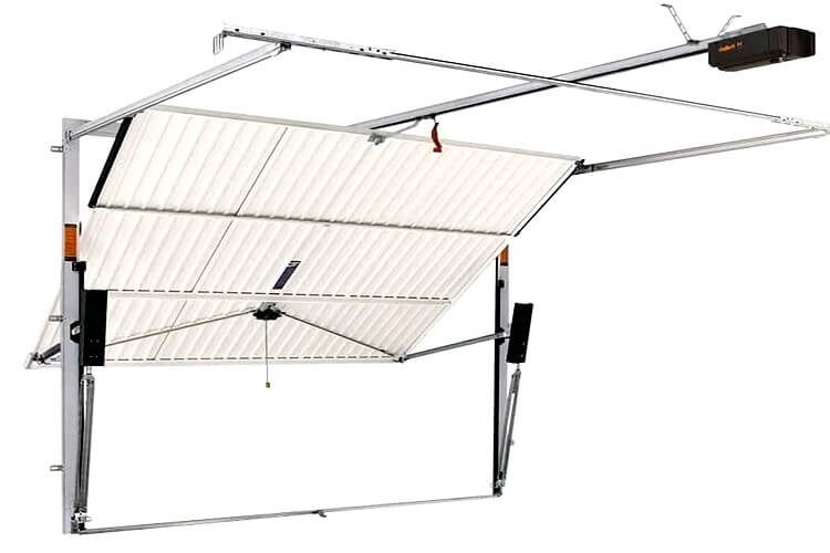 Dans ce cas, lors de l'ouverture du vantail, il effectue d'abord une rotation autour de l'axe horizontal et change sa position verticale en horizontale, puis passe sous le plafond le long de guides spéciaux.