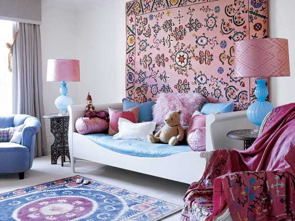 Si vous souhaitez attacher un tapis mural à la chambre, vous ne devriez pas vraiment penser à la forme, à la texture - l'essentiel est qu'il détende et favorise la relaxation, ne provoque pas d'agression. Dans la chambre des enfants, il est préférable d'utiliser des teintes assez lumineuses mais agressives.