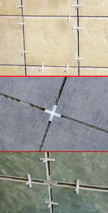 - Il y a une opinion que vous pouvez installer une croix au centre de chaque côté de la tuile (cette option est préférable à utiliser si la tuile présente des irrégularités importantes aux extrémités), afin que les coutures soient obtenues aussi uniformes que possible;
