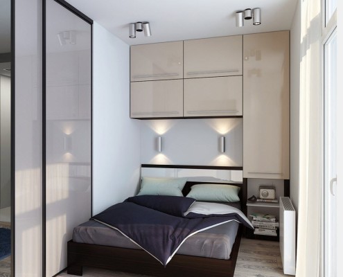 Au lieu de lampadaires massifs il est préférable d'utiliser des appliques murales: de précieux centimètres carrés de la zone seront économisés sans perte de fonctionnalité globale. Les tables de chevet peuvent également être remplacées par quelque chose de plus élégant: joyeusetés, étagères, une console basse, etc., vous pouvez également utiliser des armoires hautes et étroites. Toutes les petites choses peuvent être repliées sur le lit, si vous y organisez une étagère. Généralement dans les petites chambres les systèmes de stockage du plan horizontal est préférable de passer à la verticaleet organisez les étagères jusqu'au plafond: elles peuvent remplacer même les commodes les plus massives en termes de capacité.