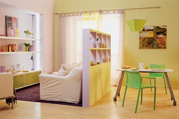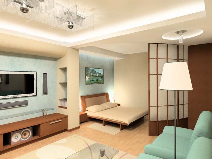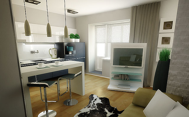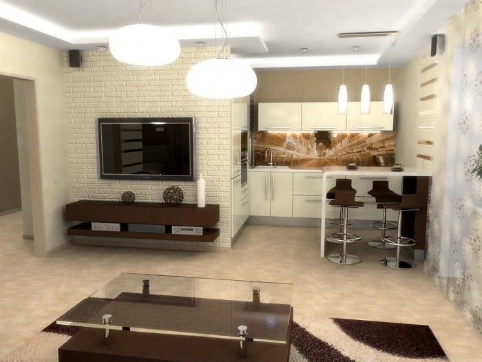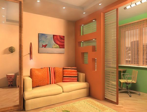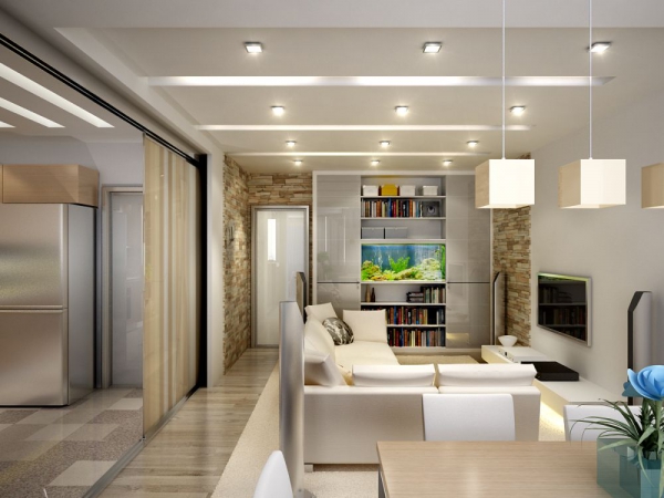Zonage dans un petit appartement une attention particulière doit être accordée, car il ne doit pas y avoir de frontières rugueuses entre les différentes parties de la pièce. Nous devons tout arranger pour que la ligne entre la cuisine et le salon soit claire, mais en même temps, essayez de le faire pour ne pas encombrer la pièce. Voilà pourquoi pour le zonage, vous pouvez utiliser meubles, lumière écrans, comptoirs de bar, cloisons vitrées, etc. Vous pouvez même séparer le salon un tapis, éclairage ou podium.