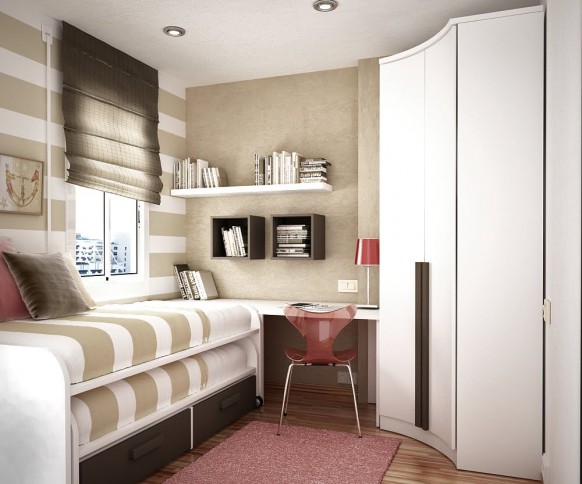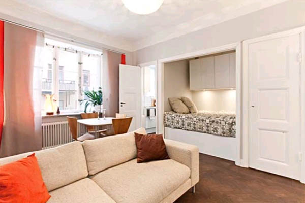 Stockage intégré - Une autre façon d'économiser de l'espace utile dans l'appartement, et vous pouvez intégrer des tiroirs, des étagères et des casiers n'importe où, combinant des fonctions pour différents objets. Pour chaque pièce, vous devez choisir votre propre système de stockage, et il n'y a pas de moyen unique, mais essayez toujours de tirer le meilleur parti de l'espace de coin. Une armoire coulissante est préférable de choisir avec un miroir ou une surface réfléchissante pour plus que compenser la place qui passait sous le système de stockage lui-même.