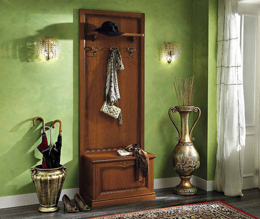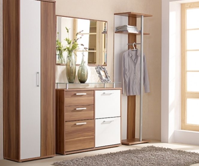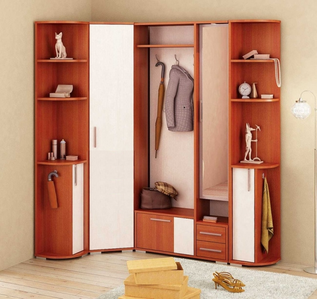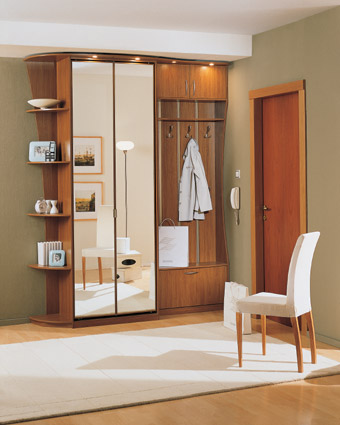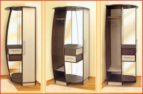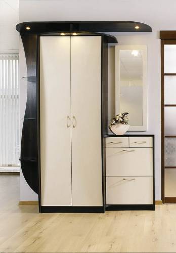 Il est assez difficile d'imaginer une salle sans armoire, car c'est lui qui stocke les choses nécessaires telles que vestes, chapeaux, foulards, gants et autres accessoires. Bien sûr, l'option idéale est garde-robe, d'autant plus que maintenant vous pouvez trouver ou, dans des cas extrêmes, faire commander un modèle de presque n'importe quelle taille. Il ne convient pas aux couloirs les plus spacieux, car il est spacieux, mais en même temps, le système d'ouverture des portes est coulissant, ce qui signifie qu'ils n'interféreront pas avec le mouvement et bloqueront complètement la sortie de l'appartement, comme les portes battantes.