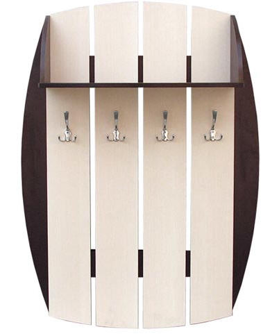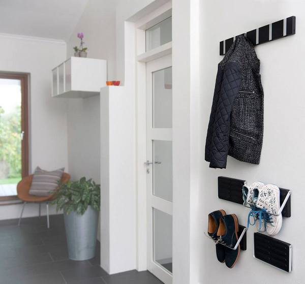 Mais néanmoins on ne peut certainement pas se passer d'un cintre dans le hall: il peut s'agir soit d'un petit bar à plusieurs crochets soit d'un modèle au sol. La deuxième option, bien sûr, est plus pratique, plus jolie, mais en raison de son volume, il n'est pas possible de la placer dans chaque couloir. Fixé au mur cintres peut être équipé d'un nombre différent de crochets situés à la même hauteur ou à différentes hauteurs, et au-dessus d'eux une petite étagère peut être installée pour ranger les chapeaux ou les parapluies. C'est l'une des options les plus compactes, qui reste en même temps fonctionnelle.
