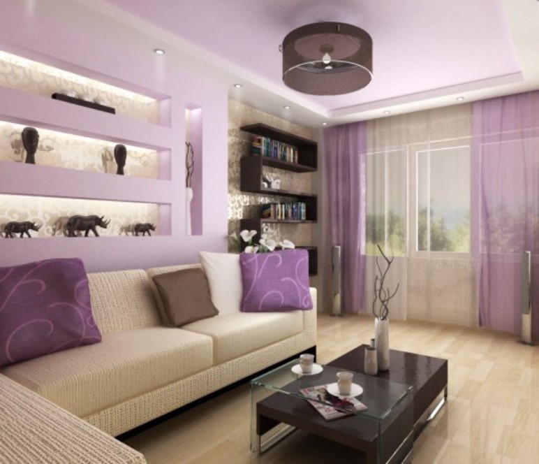 Lorsque vous voulez donner du confort et de la chaleur au salon, vous allez nuances chaudes: orange, rose, jaune, pêche, etc. Une telle salle est idéale pour des rassemblements dans le cercle des personnes les plus proches. Si le salon est un lieu de repos et de détente pour vous, vous pouvez utiliser nuances fraîches: bleu clair, vert clair, grisâtre et autres.