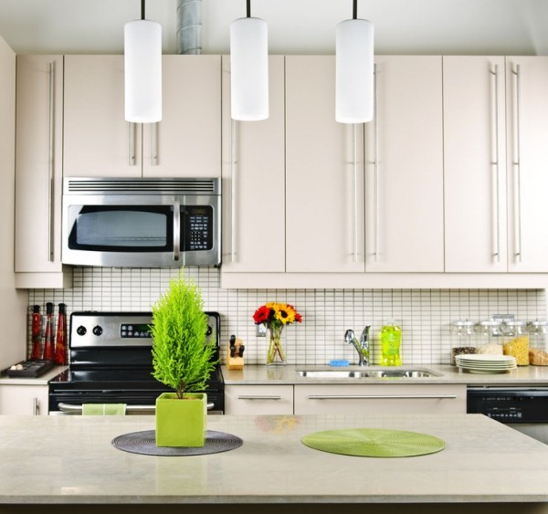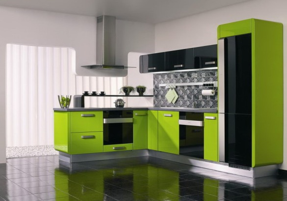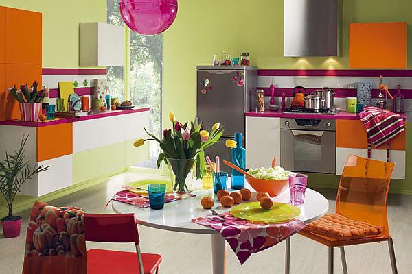 Quant aux couleurs spécifiques, tout dépend de vos préférences, et la cuisine peut maintenant être de toutes les couleurs imaginables et inimaginables. La règle bien connue s'applique ici: les nuances claires agrandissent visuellement l'espace, donc si vous avez une petite cuisine, ne la chargez pas meubles sombres, qui aura l'air harmonieux dans une pièce spacieuse. Vous pouvez choisir couleurs vives: orange, vert, jaune, rouge, puis la cuisine deviendra un endroit élégant et intéressant. Peut même utiliser teintes juteuses contrastées, mais rappelez-vous en même temps qu'elles ne sont pertinentes que dans les pièces spacieuses. Dans les petites pièces, les nuances claires et pastel épargnent, et pour que la cuisine ne soit pas très terne et décolorée, ajoutez simplement quelques accessoires lumineux: rideaux, nappes ou serviettes. Aussi pour cuisines miniatures Des nuances telles que vert clair, bleu clair, jaune clair, pêche, gris clair, etc. conviennent.