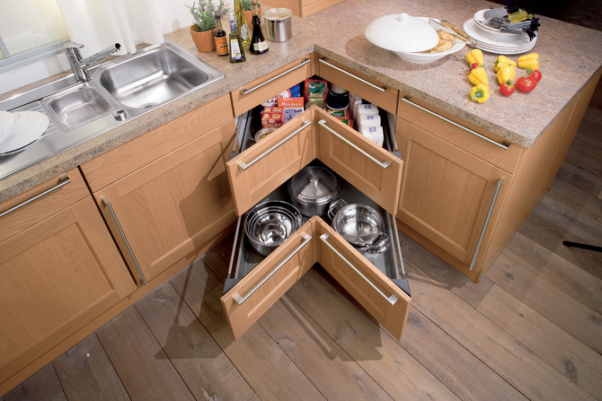 Quant à mobilier d'espace intérieuralors l'offre moderne est tout simplement incroyable. Les cuisines combinent des étagères coulissantes, des tables de chevet, des étagères rotatives, des armoires d'angle avec des mécanismes d'ouverture / fermeture complètement différents. Vous devez choisir une telle option qu'il est pratique d'utiliser tous les éléments et qu'ils soient situés de la manière la plus ergonomique possible. N'oubliez pas non plus que les espaces de rangement peuvent être agrandis avec toutes sortes d'étagères, crochets, etc.