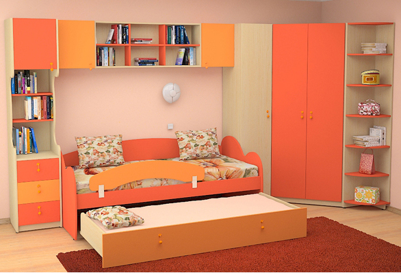 Mais, probablement, la première chose que les parents prennent en compte lors du choix des meubles pour la pépinière, ainsi que lors de la détermination de la palette de couleurs générale, est sexe de l'enfant. Les couleurs ont longtemps été fermement divisées dans nos esprits: par exemple, le rose, la pêche, le jaune, l'orange sont choisis pour chambres de filleset vert, bleu, violet - pour chambres de garçonbien qu'ils conviennent dans les deux cas. Si des enfants de sexe opposé vivent dans la chambre, vous pouvez choisir des meubles similaires, mais de couleurs différentes, divisant ainsi le territoire.