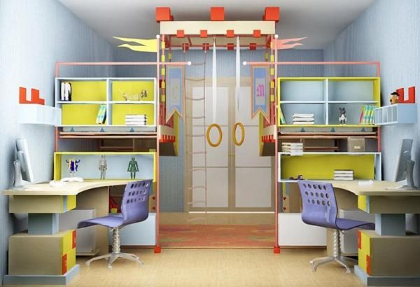 C'est plus difficile si la pièce doit être équipée d'espace immédiatement pour deux enfants, et encore plus difficile s'ils sont de sexe différent. Dans tous les cas, il sera nécessaire de placer deux lits et, si possible, deux bureaux, et de rendre l'aire de jeux commune. S'il y a très peu d'espace, des lits superposés viennent à la rescousse et des coins entiers pour enfants, qui sur quelques mètres carrés peuvent accueillir une couchette, une aire de jeux et un bureau.