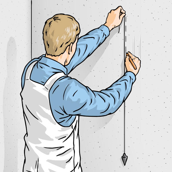 Pour obtenir le résultat le plus esthétique, il vaut mieux marquer le mur. Une distance égale à la largeur du papier peint est tracée à partir du coin, et une ligne strictement verticale est tracée à l'aide d'un niveau et d'un crayon. Ces lignes peuvent être tracées le long du mur entier afin que le papier peint soit aussi simple que possible.