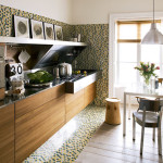 Si nous parlons d'une petite cuisine, la façon la plus simple de la diviser en zones est d'utiliser différent matériaux de finition comme pour les mursdonc et pour le sol. Donc, dans la zone de travail du mur est le meilleur carrelé, et utilisez un matériau plus chaud et plus confortable près de la table à manger: lavable papier peint, plâtre décoratif ou peinture d'une certaine teinte. La transition entre différents matériaux doit être perceptible, mais elle ne doit pas être trop contrastée, car la pièce doit être perçue comme intégrale et harmonieuse, mais en même temps avec plusieurs zones mises en évidence.