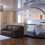 Si la cuisine est assez grande ou que vous équipez le salon-cuisinealors vous pouvez utiliser non seulement le zonage visuel, mais aussi tout à fait physique. Ce pourrait être, par exemple, le podiumsur lequel sera situé le coin repas. C'est une excellente technique de conception, qui vous permet d'obtenir un espace de stockage supplémentaire, mais cela vaut la peine de considérer à quel point cela sera pratique dans votre cas particulier: peut-être qu'il y a des personnes âgées et des petits enfants dans la famille qui trouvent ce podium difficile. La zone de travail est parfois isolée par un podium, mais cela s'explique souvent par la nécessité de cacher les communications. Éclairage supplémentaire du podium apportera la touche finale au zonage de la pièce, et en même temps vous permettra de créer un intérieur insolite.