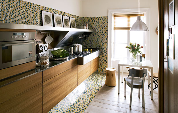 Quant à plancher, il peut également être utilisé pour distinguer les zones. Généralement pour le zonage, il est préférable de combiner plusieurs méthodes à la fois, puis vous pouvez créer un espace de travail et de restauration à part entière. Dans la cuisine, vous pouvez utiliser deux revêtements de sol différents: dans la zone lavage de voituresurface de travail dalles et réfrigérateur - carreaux ou carreaux de porcelaine, par exemple, et dans le reste de la cuisine, qui est destiné à la détente, à l'utilisation revêtement de sol stratifié ou linoléumpour rendre l'espace confortable.Certains concepteurs conseillent de diviser l'espace en zones en utilisant le même matériau pour la finition du sol, mais dans une teinte différente, ce qui semble également intéressant.