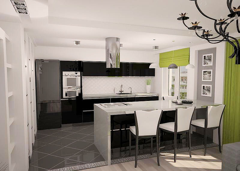 Aujourd'hui comptoir de bar - l'un des moyens les plus populaires de diviser l'espace, et il peut être utilisé à la fois dans les cuisines ordinaires et dans les cuisines-salons. Naturellement, cette option n'est pas pour les plus petites cuisines, mais pour de nombreuses pièces plus ou moins spacieuses, elle est très adaptée.
