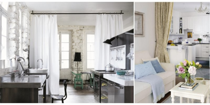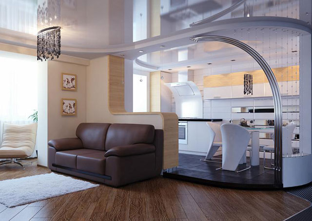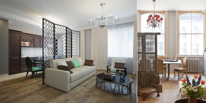 Vous pouvez créer entre la cuisine et le salon un petit cloison en placoplâtrequi prendra la forme arches ou demi-arches. Peut utiliser cloison en bois et verre: en raison de sa transparence, il ne réduira pas la pièce, mais il la divisera clairement en zones. En tant que partitions, vous pouvez même utiliser écrans et tissu, car ce sont des matériaux légers et mobiles qui s'adaptent parfaitement au rôle de séparation des pièces lorsque cela est nécessaire, et sont faciles à nettoyer si vous le souhaitez.
