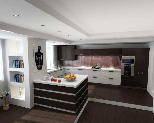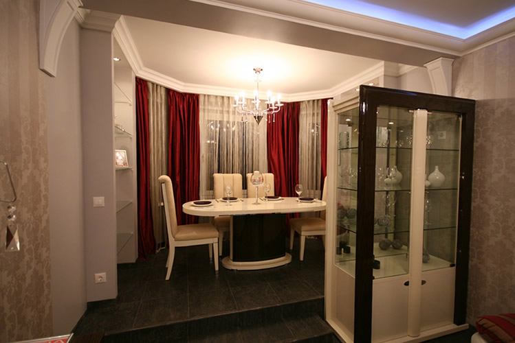 Si la cuisine est assez grande ou que vous équipez le salon-cuisinealors vous pouvez utiliser non seulement le zonage visuel, mais aussi tout à fait physique. Ce pourrait être, par exemple, le podiumsur lequel sera situé le coin repas. C'est une excellente technique de conception, qui vous permet d'obtenir un espace de stockage supplémentaire, mais cela vaut la peine de considérer à quel point cela sera pratique dans votre cas particulier: peut-être qu'il y a des personnes âgées et des petits enfants dans la famille qui trouvent ce podium difficile. La zone de travail est parfois isolée par un podium, mais cela s'explique souvent par la nécessité de cacher les communications. Éclairage supplémentaire du podium apportera la touche finale au zonage de la pièce, et en même temps vous permettra de créer un intérieur insolite.