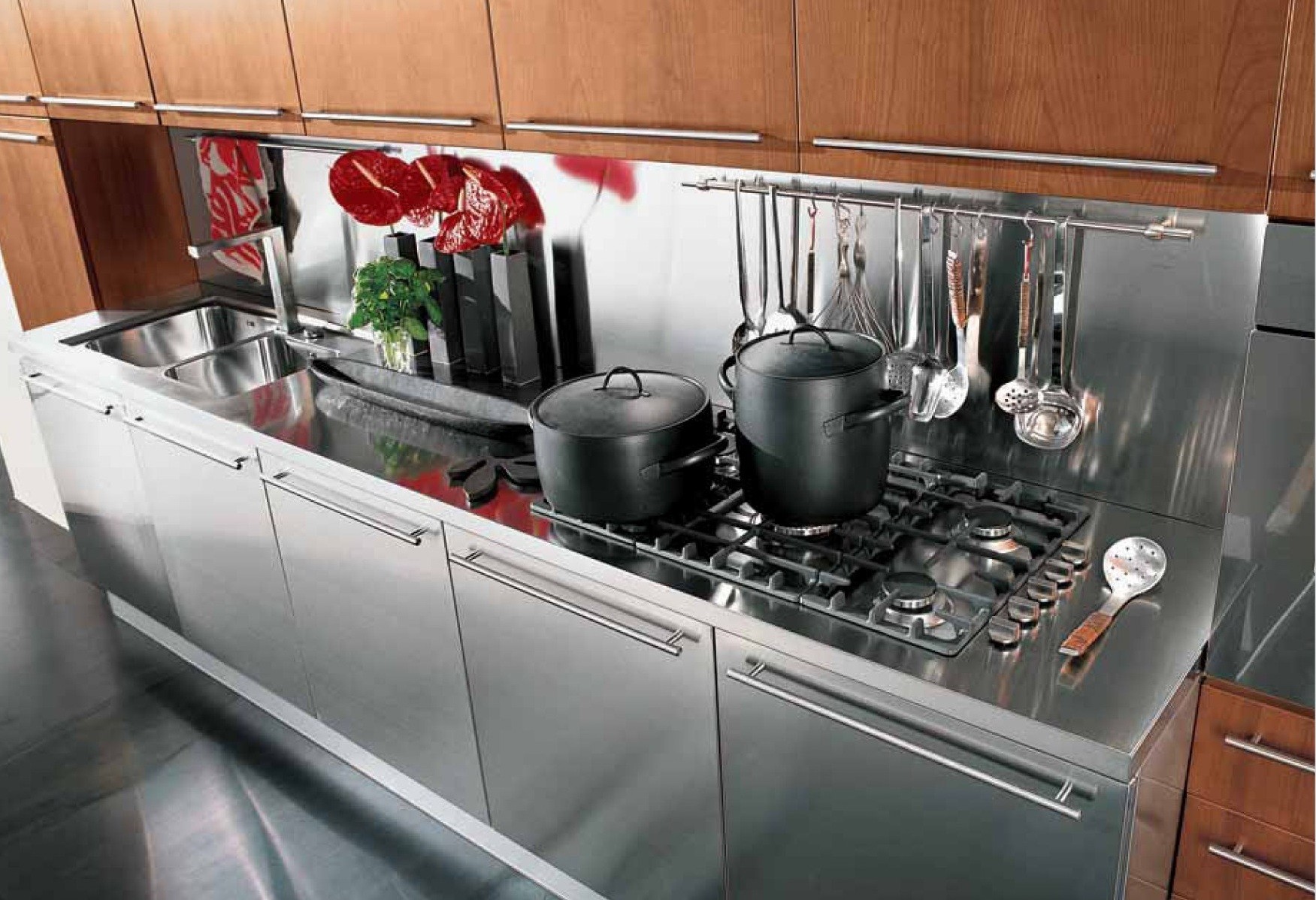Un tablier métallique ne rentrera que dans intérieur en style contemporain. Les avantages d'une telle solution sont nombreux: durabilité, résistance au feu et à l'eau, produits chimiques. En même temps, vous devez supporter le fait que sur le métal toutes les éclaboussures sont clairement visibles, gouttes, taches. Ils devront être essuyés régulièrement pour donner au revêtement un aspect idéal, mais ce n'est pas si difficile, d'autant plus que vous pouvez vous débarrasser de la saleté assez rapidement.