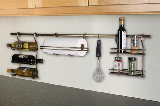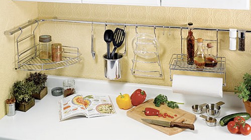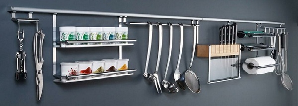 Sous le mot complexe "balustrade" est complètement caché construction simple. Il s'agit d'une barre métallique fixée au mur. Vous pouvez y placer des louches, des passoires, des essuie-tout, des couvercles de casseroles, même des bouteilles d'huile et d'autres ustensiles, et cela est possible grâce à une variété d'accessoires articulés.